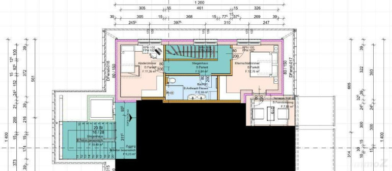 Die Wohnung hat im Obergeschoß 2 Schlafzimmer und Bad mit WC und ein kleiner Balkon beim Elternschlafzimmer.
