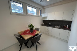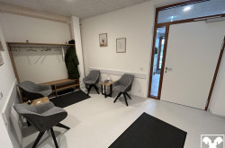 Moderne, neu errichtete Praxisräume im Erdgeschoss (Praxisraum 2 Gemeinschaftspraxis) im Ärztehaus humanum Alkoven. Wartebereich, Teeküche und Sanitärräume werden gemeinschaftlich genutzt.