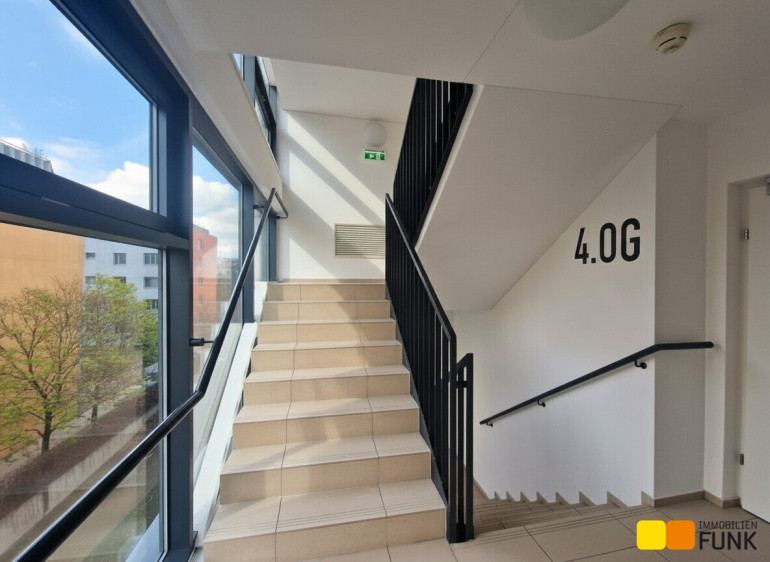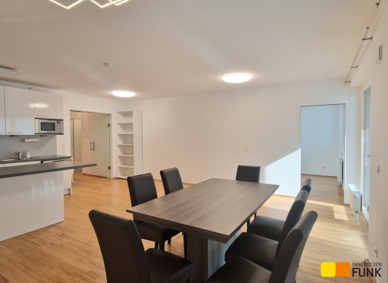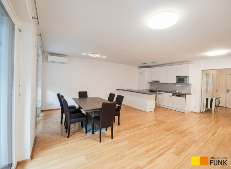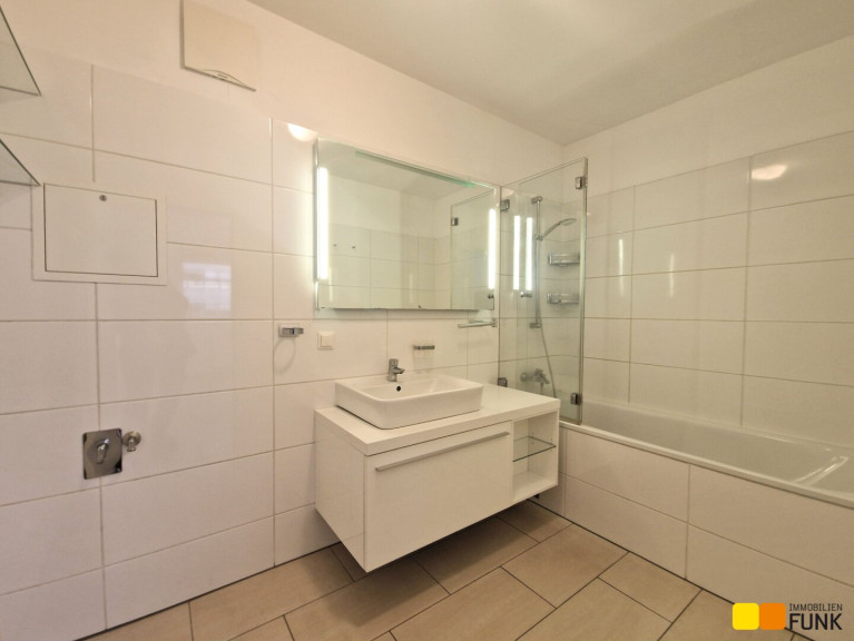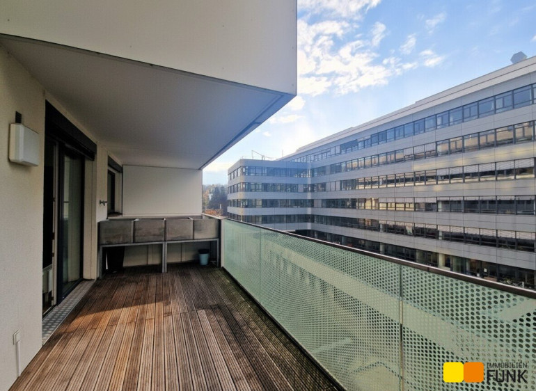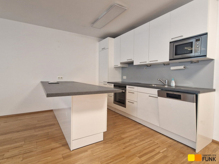 Die Wohnung befindet sich in einem Neubau (2010) in der vierten Etage, bietet ca. 62,6 m² Wohnfläche und verfügt über 2 Zimmer. Sie betreten die Wohnung über einen Vorraum, von dem Sie linker Hand Zugang zu einer begehbaren Garderobe und rechter Hand zum WC haben. Geradeaus gelangen Sie durch eine attraktive Glastür in die großzügige ca. 34 m² große Wohnküche mit Zugang zu dem ca. 14 m² großen, nach Westen ausgerichteten Balkon. Dort stehen Hochbeete zur Bepflanzung bereit. Die moderne und voll ausgestattete FM-Küche präsentiert sich neuwertig und verfügt über die erforderlichen Elektrogeräte. Von der Wohnküche aus gelangen Sie weiter in das ca. 15 m² große Schlafzimmer und das ca. 5 m² große en suite Badezimmer. Dieses ist mit Badewanne, Glasduschwand, Waschtisch, Spiegel sowie Handtuchheizkörper und Waschmaschinenanschluss ausgestattet. In den Wohnräumen ist Parkettboden, in den Sanitärräumen sind Fliesen verlegt.