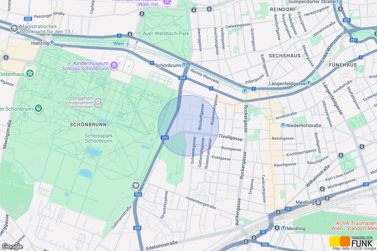 Zum Verkauf gelangt eine neuwertige und ruhige Zweizimmerwohnung im 12. Wiener Gemeindebezirk. Über das nahgelegene Meidlinger Tor gelangen Sie zum 160 Hektar großen Areal des Schönbrunner Schlossparks, der zu recht als beliebtestes Erholungsgebiet Wiens gilt. Die prachtvolle Parkanlage lädt zu ausgedehnten Spaziergängen, zum Joggen oder anderen Freizeitaktivitäten ein. Die direkte Umgebung bietet eine Vielzahl einladender Restaurants, Cafés und Lokale. Die Bushaltestelle Tivolistraße der Linien 9A und 63A ist nur 1 Gehminute entfernt, während Sie zur Bushaltestelle Bischoffgasse der Linie 10A in ca. 4 Gehminuten gelangen. Nur etwa 500 m entfernt befindet sich die U4-Bahnstation Schönbrunn, die Ihnen eine hervorragende Anbindung an das öffentliche Verkehrsnetz bietet. So gelangen Sie in das Stadtzentrum Wiens (Stephansplatz) in ca. 27 Minuten.