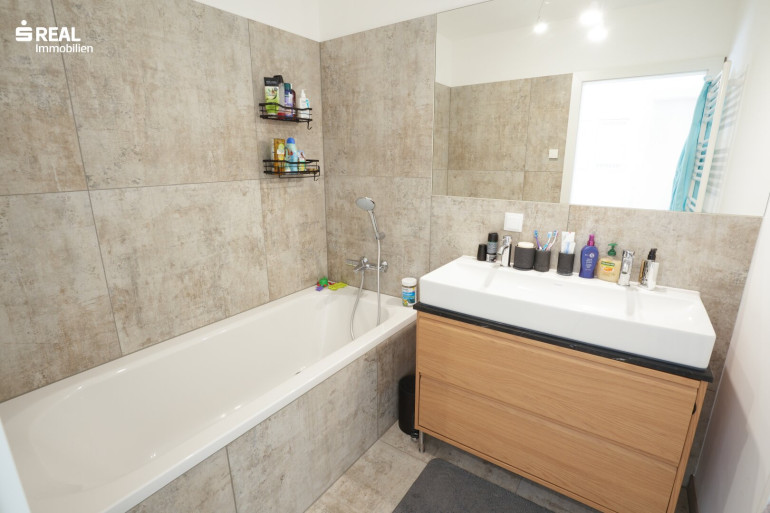 - bodengleiche Dusche mit eleganter, verdeckter Abflussrinne sowie Badewanne