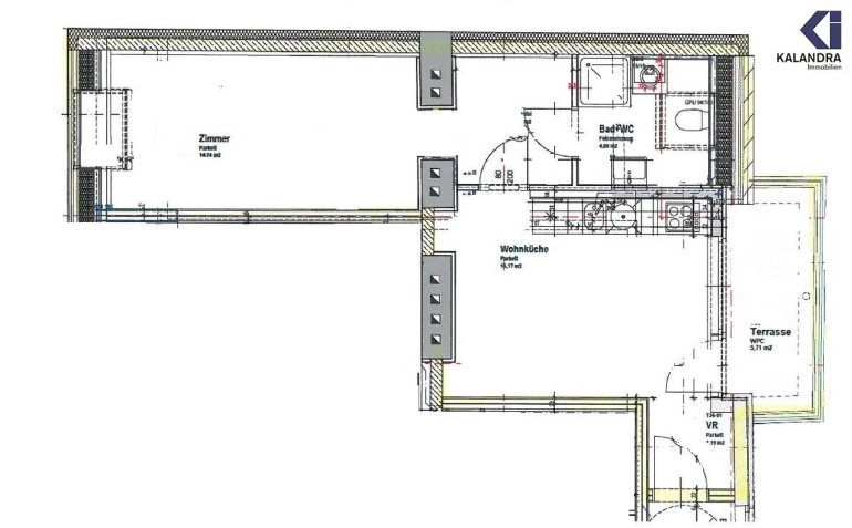 Vorraum, 15 m² Wohnraum mit offener Küche, Ausgang auf eine 6m² große Terrasse,Schlafzimmer ( 14m² ) , Bad mit Wanne & Dusche, Waschbecken, WC