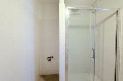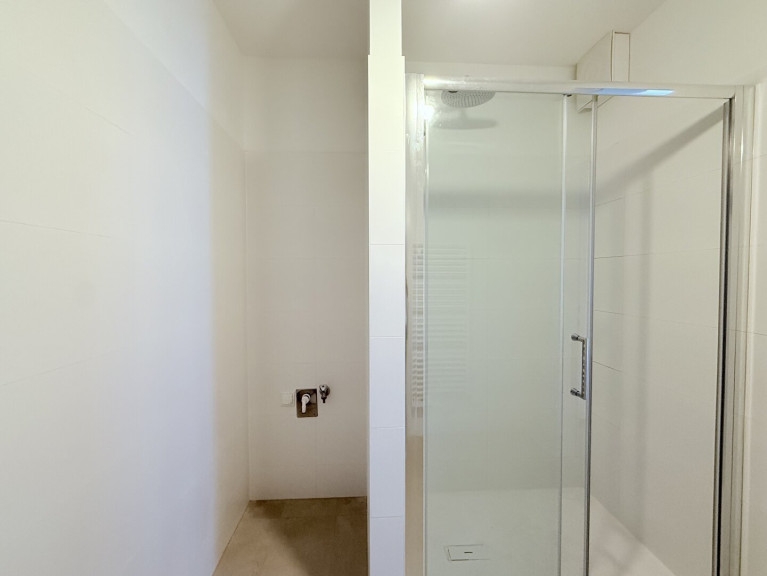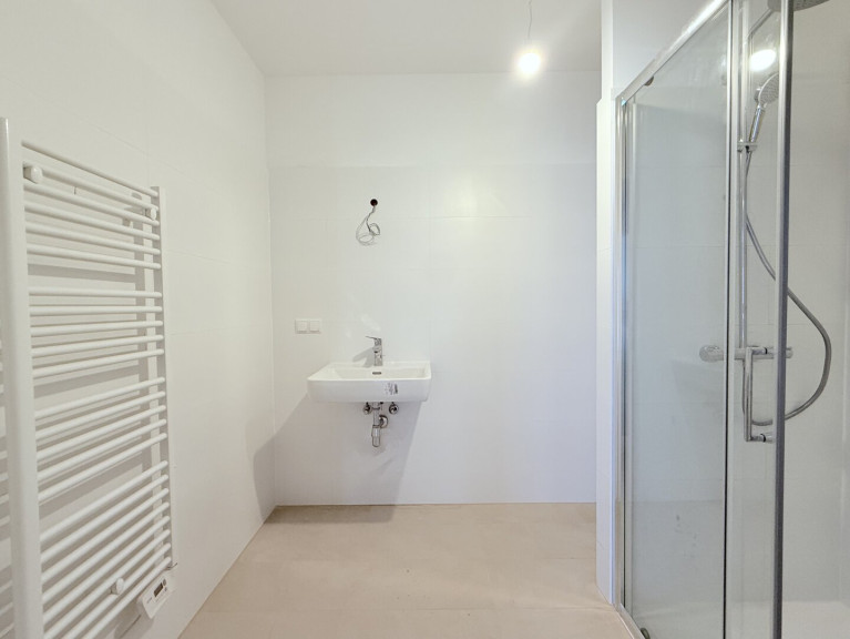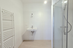 - Badezimmer mit Dusche, Handwaschbecken und Waschmaschinenanschluss