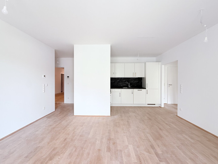 Zum Verkauf gelangt diese perfekt geschnittene Dreizimmerwohnung mit westseitigem Balkon im ersten Liftstock eines sehr geschmackvollen Neubauhauses (Fertigstellung November 2025) in Grün-Ruhelage.
