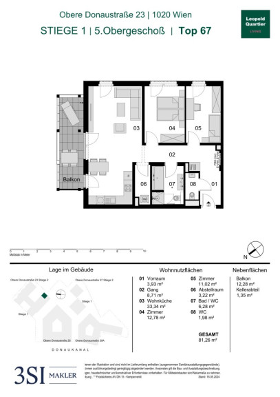 Diese moderne Wohnung befindet sich im 5. Obergeschoß. Die Einheit verfügt über eine Wohnnutzfläche von insgesamt 81,26 m² und bietet zusätzlich einen ca.12,28 m² großen Balkon.