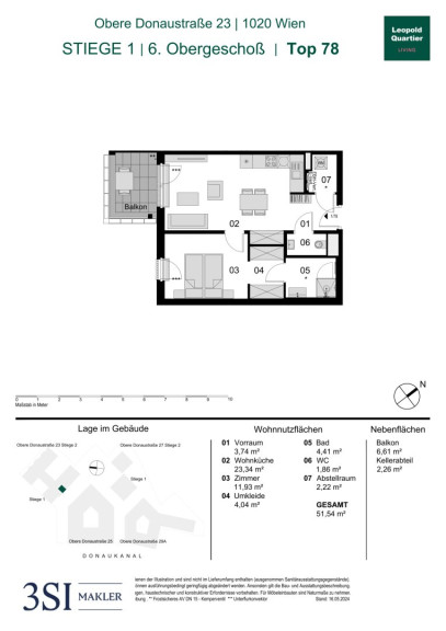 Diese moderne Wohnung befindet sich im 6. Obergeschoß. Die Einheit verfügt über eine Wohnnutzfläche von insgesamt 51,54 m² und bietet zusätzlich einen ca. 6,61 m² großen Balkon.