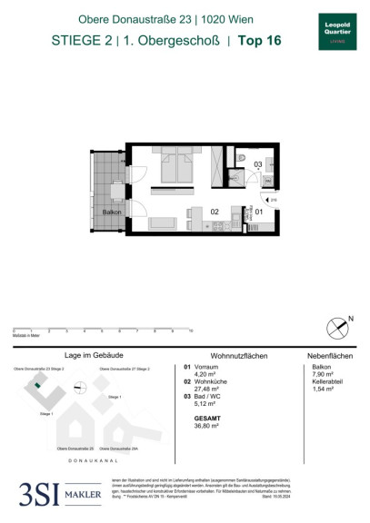 Diese moderne Wohnung befindet sich im 2. Obergeschoß. Die Einheit verfügt über eine Wohnnutzfläche von insgesamt 37,09 m² und bietet zusätzlich einen ca.7,9 m² großen Balkon.