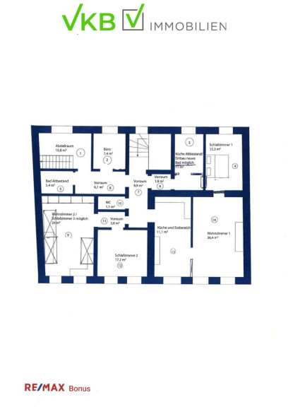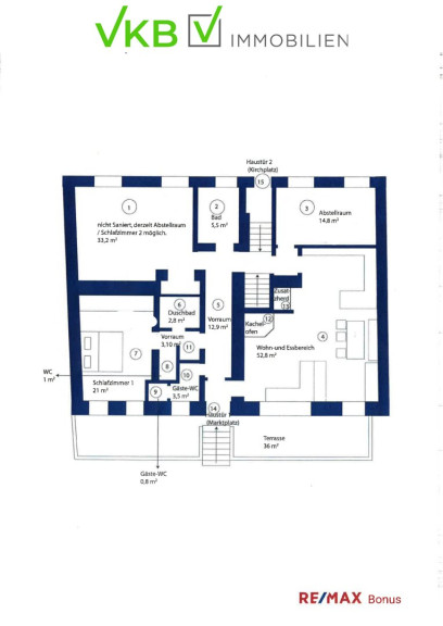 Unverbindliche Unterlage. Die angegebenen Informationen sind nach bestem Wissen erstellt, Druck- bzw. Redaktionsfehler oder Irrtümer vorbehalten. Für Angaben, Auskünfte und Flächen, die uns von Eigentümerseite bzw. Dritten zur Verfügung gestellt wurden, können wir keine Haftung übernehmen. Gem. § 5, Abs. 3 Maklergesetz weisen wir darauf hin, dass die Firma VKB-Immobilien GmbH als Doppelmakler tätig ist.