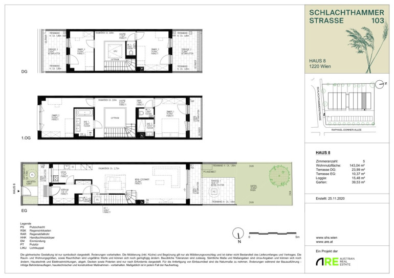 Das Projekt in der Schlachthammerstraße liegt in Essling östlich des Wiener Stadtzentrums, zwischen Aspern und der Seestadt, Hirschstetten und dem Marchfeld. Die Buslinie 98A fährt direkt zur U2, und auch die Buslinien 26A, 88A, 88B und N26 sind in wenigen Minuten zu Fuß erreichbar. Darüber hinaus führt ein durchgehender Radweg mit einer Fahrzeit von etwa 30 Minuten ins Stadtzentrum: durch die Lobau und über die Donauinsel, durch den Prater und die Donaulände entlang. Zu Fuß ist der Nationalpark Donau-Auen rund 15 Minuten entfernt.Beschreibung der Immobilie