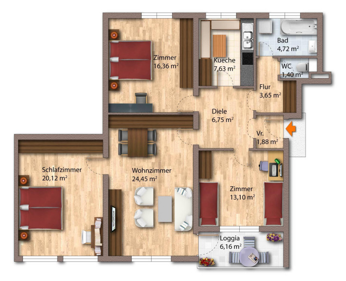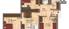 Raumaufteilung: Vorraum, Badezimmer, WC, Küche, Wohnzimmer, 3 Schlafzimmer, Loggia, Kellerabteil, Abstellraum