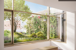 Treppenaugen bringen Tageslicht tief in die Allgemeinbereiche. Einen wichtigen Beitrag zum sommerlichen Hitzeschutz leisten begrünte Freiraumzonen vor den Wohnungen sowie