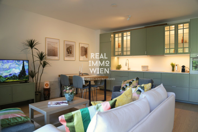 Der lichtdurchflutete Wohnbereich mit integrierter moderner Küche schafft ein angenehmes Raumgefühl. Die Küche ist funktional und stilvoll ausgestattet und fügt sich harmonisch in das offene Wohnkonzept ein. Die großzügige Loggia-Terrasse mit Blick ins Grüne lädt zu entspannten Stunden im Freien ein – ob bei einem Kaffee am Morgen oder einem Glas Wein am Abend.