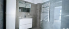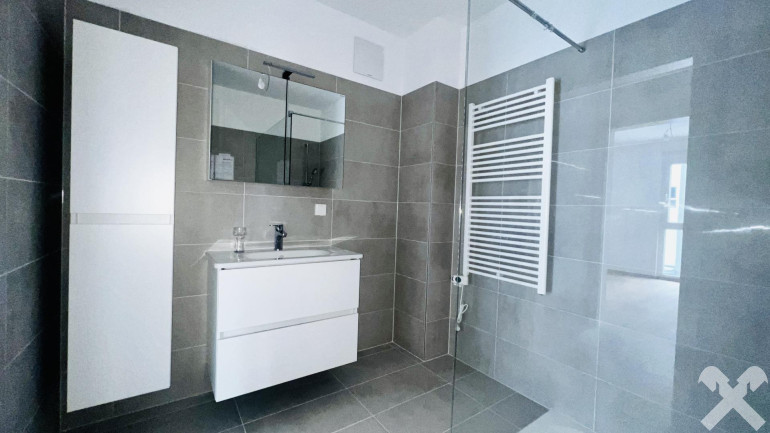- Bad mit Dusche: Das moderne Badezimmer ist mit einer bodengleichen Dusche, einem Waschtischverbau mit Spiegelschrank und einem praktischen Sprossenheizkörper ausgestattet.