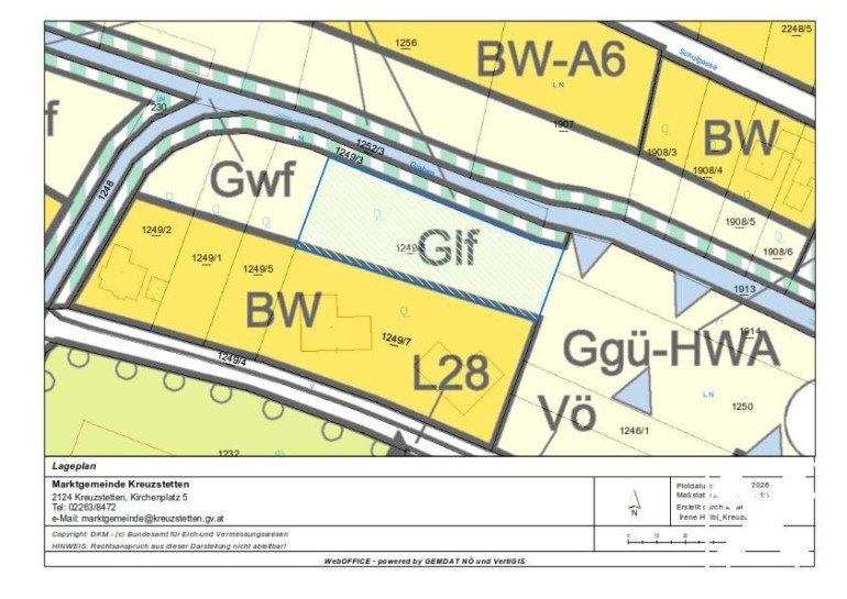 Dieses Baugrundstück ist aufgeschlossen und befindet sich am ruhigen Ortsrand von Oberkreuzstetten, einer Katastralgemeinde der Marktgemeinde Kreuzstetten im Bezirk Mistelbach, Niederösterreich. Die Gegend besticht durch ihre sanften Hügel, Weinberge und gepflegten Kellergassen, die ein naturnahes und ruhiges Wohnumfeld schaffen.