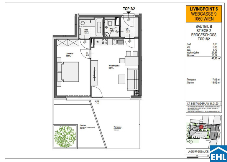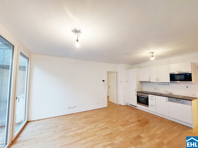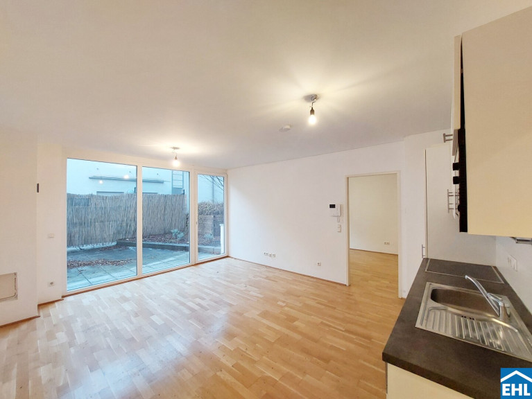 Die verfügbare Wohnung befindet sich im Erdgeschoss eines modernen Gebäudes. Sie verfügt über eine Wohnküche, ein getrennt begehbares Schlafzimmer, ein Badezimmer mit Wanne und Waschmaschinenanschluss, eine separate Toilette und einen Vorraum. Das Highlight ist zweifellos die 17 m² große Terrasse und der großzügige 18 m² große Garten!