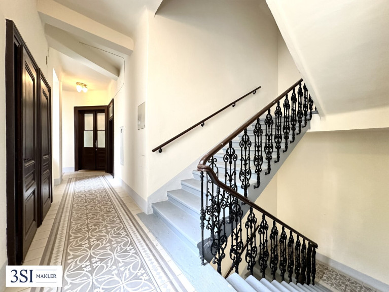 Das Haus umfasst drei elegante Regelgeschoße – aktuell noch ohne Personenlift, dafür mit umso mehr Charakter.