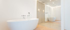 - Badezimmer mit Dusche und Wanne und Zugang zu einem kleinen Balkon