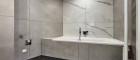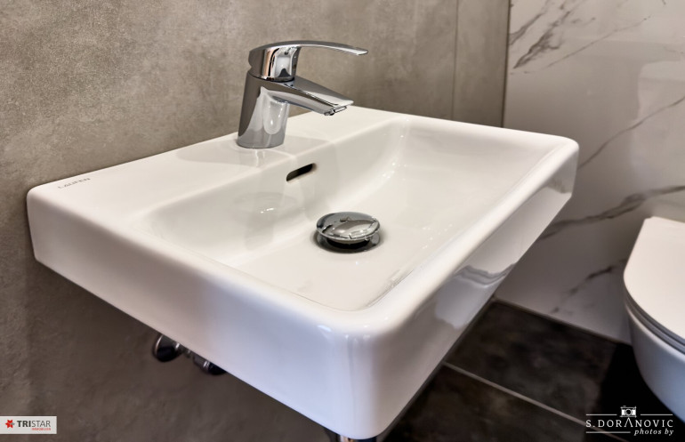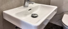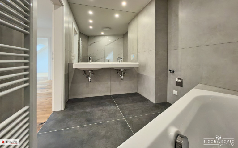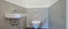 - Sanitär: Fußbodenheizung in Bädern, Wand-WC (Tiefspüler), Handwaschbecken (43x34 cm), Waschtisch (120x46 cm), Chrom-Armaturen, Duschkopf, Mischer, Handbrause.