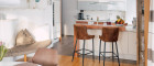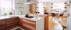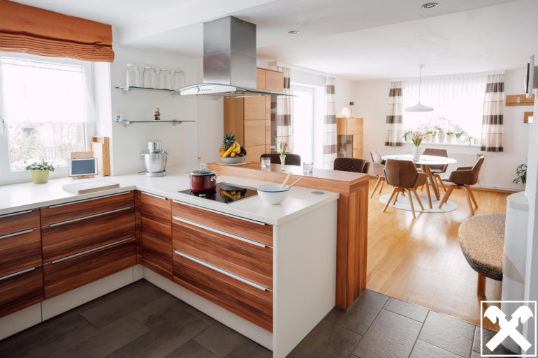Große, offene Küche mit Essbereich und gemütlichem Kachelofen