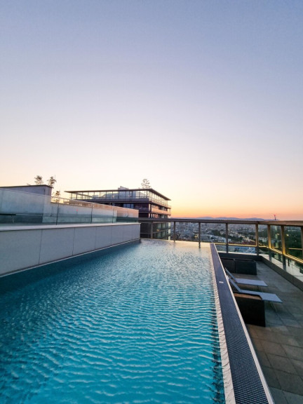 Parkett, Fliesen, Zentralheizung, Einbauküche, Personenaufzug, Ostbalkon, Angeschl. Bar, Badewanne, Wachdienst, Garage, Swimmingpool, Kantine/Cafeteria