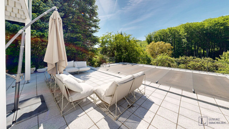 Auf dem Grundstück befindet sich ein charmanter Altbestand aus den 1960er-Jahren. Das jetzige Haus ist grundsätzlich bewohnbar und bietet viel Raum für eine umfassende Modernisierung. Die Fenster und Heizung wurden 2015 erneuert, eine neue Heiztherme wurde 2022 eingebaut. Die Wohnfläche beträgt ca. 200 m², ergänzt durch vier Terrassen mit rund 140 m².