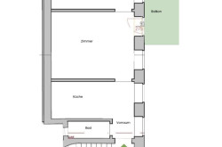 Vom Vorraum der Wohnung gelangen Sie zu Ihrer Linken in das Badezimmer, weiters in die Küche und in das Wohnzimmer (Zimmer 1) mit Ausgang auf den Balkon. Bei der Küche handelt es sich um eine Einbauküche mit Arbeitsplatte, Stauraum in Schränken, Herd, Ofen und Spüle.