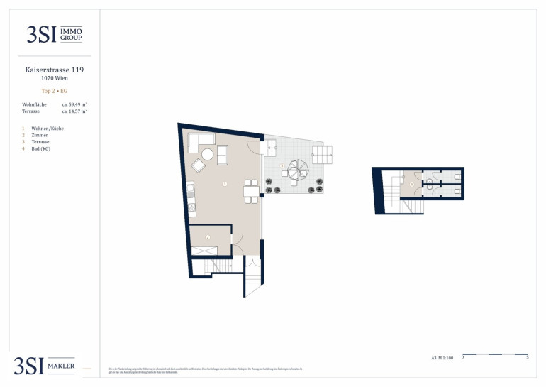 Zusätzlich verfügt die Wohnung über eine eigene Terrassenfläche im Innenhof mit ca. 14,57 m², die zum Verweilen und Entspannen einlädt.