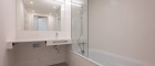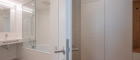 Badezimmer: ausgestattet mit Badewanne, Handwaschbecken, beheiztem Handtuchhalter, Wandspiegel und einem Waschmaschinenanschluss.
