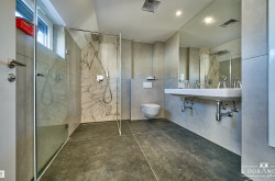 Fußbodenheizung im Bad, Wand-WC (Tiefspüler), Handwaschbecken (43 × 34 cm), Waschtisch (120 × 46 cm), Chrom-Armaturen, Duschkopf, Mischer und Handbrause.