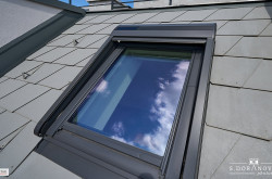 VELUX-Dachfenster mit Klappfunktion, Außenrollos mit Solar-Antrieb.