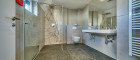 Fußbodenheizung im Bad, Wand-WC (Tiefspüler), Handwaschbecken (43 × 34 cm), Waschtisch (120 × 46 cm), Chrom-Armaturen, Duschkopf, Mischer und Handbrause.