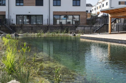 Um dieses Wohngefühl zu erzielen, war für uns besonders wichtig, dass sich die Architektur der einzelnen Häuser nahtlos in die Natur einfügt. Erreicht haben wir das unter anderem durch die teilweise Holzverkleidung der Gebäude und Begrünung der Dachflächen.