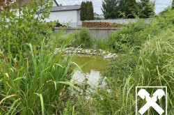 Der liebevoll angelegte Garten mit Biotop, Gartenhütte und überdachter Terrasse schafft Raum zum Entspannen.