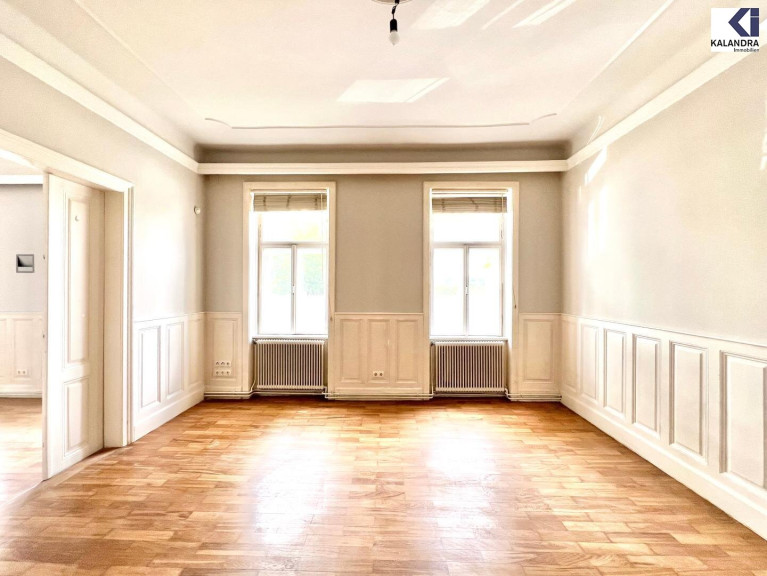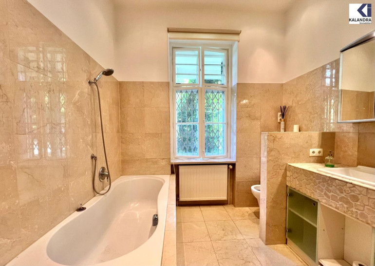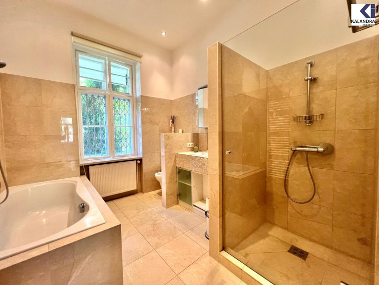 Vorzimmer, Wohnzimmer, Speisezimmer mit anschließender, offener Wohnküche, Zwischenflur zum gartenseitigen Schlafzimmer, großes Badezimmer mit Doppelwaschbecken, großer Dusche und Badewanne & WC, gartenseitiges Kabinett, separates WC, Abstellraum, große zugeordnete Waschküche im Kellergeschoß (ca. 12m²).