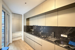 Das Apartment verfügt über eine Wohnnutzfläche von ca. 82,5 m² sowie eine Loggia mit ca. 3,7 m², die als privater Rückzugsort im urbanen Umfeld dient. Der Grundriss überzeugt durch eine optimale Raumaufteilung und klare Funktionszonen, die sowohl repräsentatives Wohnen als auch diskrete Privatsphäre ermöglichen. Der großzügige Wohn- und Essbereich bildet das Herzstück der Wohnung. Offen gestaltet und dennoch klar zoniert, bietet er Raum für stilvolles Wohnen und gesellige Abende. Die hochwertige Küche ist harmonisch integriert und fügt sich nahtlos in das elegante Gesamtbild ein.