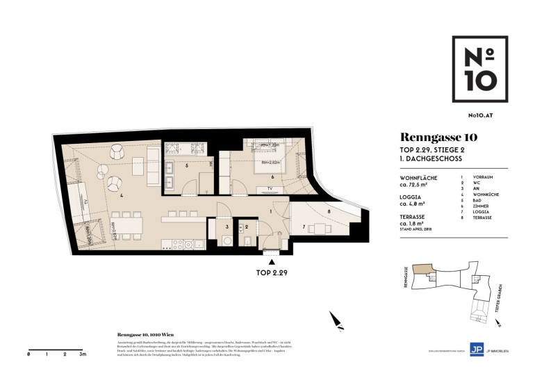 Das Apartment verfügt über eine Wohnnutzfläche von ca. 72,5 m² und befindet sich im 1. Dachgeschoss. Ergänzt wird der Wohnraum durch eine Loggia mit ca. 4,0 m² sowie eine Terrasse mit ca. 1,8 m², die einen privaten Rückzugsort im urbanen Umfeld bieten.