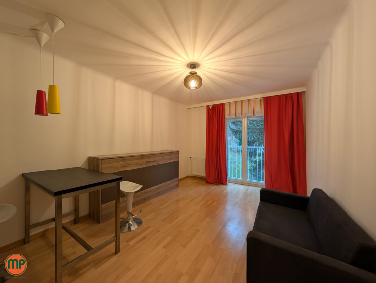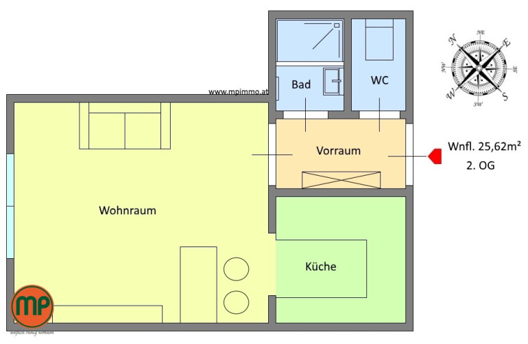 Die Wohnung selbst ist mit ihren knapp 26 m² effizient geschnitten und bietet alles, was ein Singlehaushalt braucht. Über das Vorzimmer gelangt man in das Badezimmer, die separate Toilette und das teilmöblierte Wohnzimmer mit Blick ins Grüne. Das gemütliche Sofa, sowie Tisch und Klappbett sorgen bereits jetzt für eine angenehme, heimelige Atmosphäre. Die anschließende Küche ist kompakt eingerichtet und beherbergt auch die Waschmaschine. Für alle Kochliebhaber ist sicher der Gasherd das Highlight der Küche, welcher präzises Kochen und schnelles Erhitzen ermöglicht.