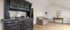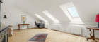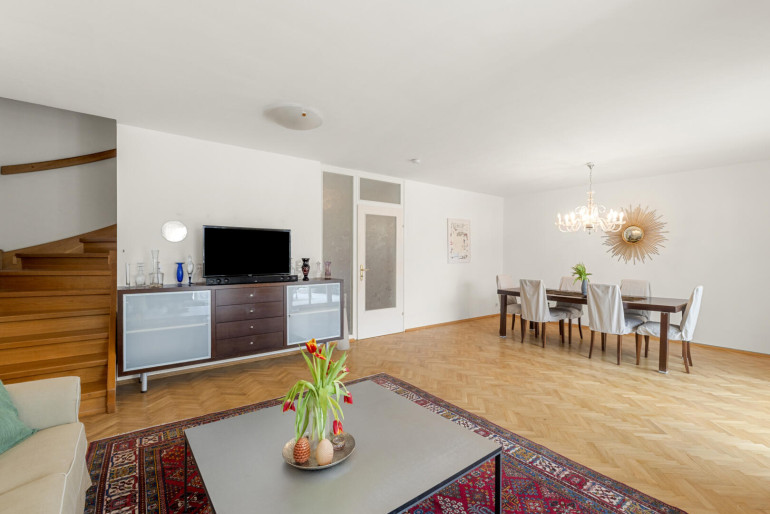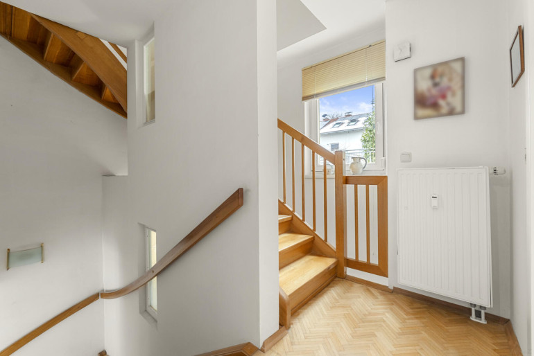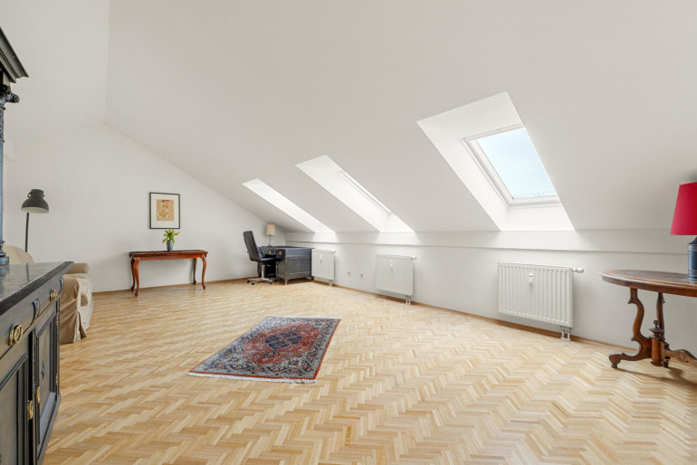 Im Obergeschoss befinden sich derzeit zwei Zimmer sowie ein Badezimmer und ein Balkon, wiederum mit schönen Ausblick. Ursprünglich waren hier drei Zimmer geplant, sodass mit geringem Aufwand eine zusätzliche Raumtrennung wiederhergestellt werden kann – ideal für Familien, Homeoffice oder individuelle Wohnbedürfnisse. Das Dachgeschoss beherbergt einen großzügigen, vielseitig nutzbaren Raum mit einem abgetrennten, begehbaren Schrank und eignet sich hervorragend als Schlafzimmer, Atelier oder Rückzugsort.