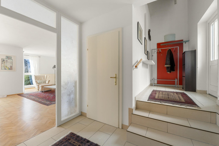 Die Liegenschaft bietet rund 158 m² Wohnfläche und überzeugt durch einen durchdachten Grundriss, der dem Haus Charakter und Großzügigkeit verleiht. Über den Windfang im Erdgeschoss gelangt man über wenige Stufen in den Flur, von wo aus man das WC sowie die Küche erreicht und weiter in den offen gestalteten Wohn-Essbereich gelangt. Große Fensterflächen schaffen eine helle, freundliche Atmosphäre und eröffnen einen schönen Ausblick, der bis zur Kirche St. Veit und die dahinterliegende Bergwelt reicht. Die vorgelagerte Terrasse erweitert den Wohnraum ins Freie und führt in den etwa 80 m² großen Garten, der ausreichend Platz für Erholung, Spielen oder gesellige Stunden im Grünen bietet.