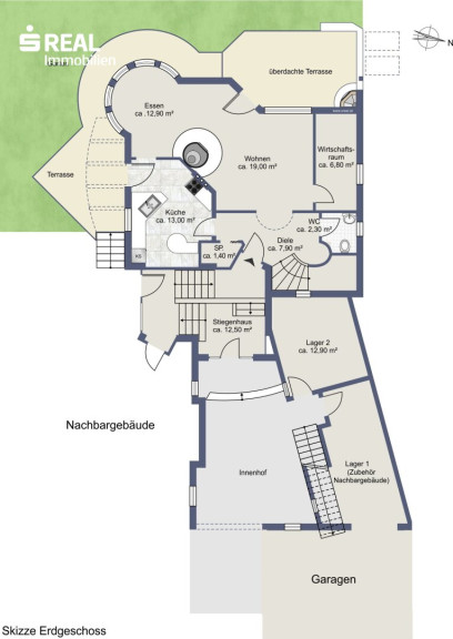 Auf der Gemeinschaftsparzelle befinden sich zwei Garagen (eine dem Haus zugehörig), die gemeinsame Zufahrt, die Gärten und der Hauszugang.