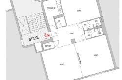 zentraler Vorraum, Grossraumbüro, zwei weitere Zimmer, 2 WCs, Abstellraum,