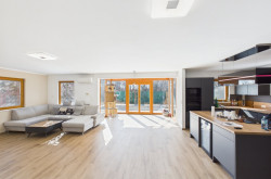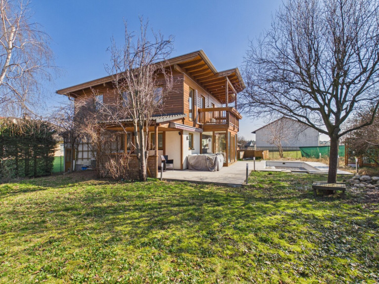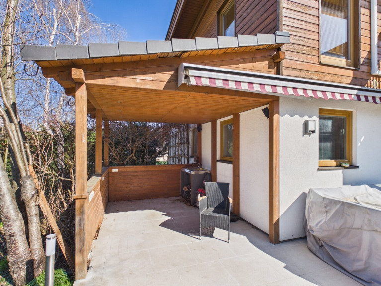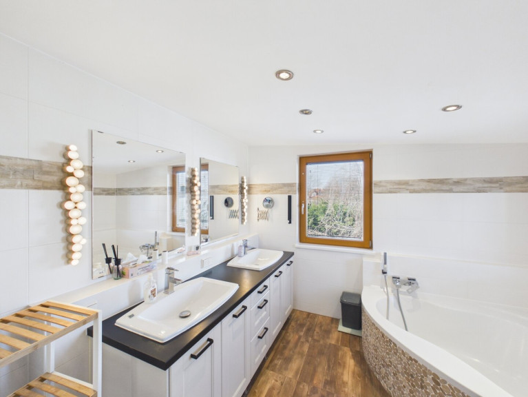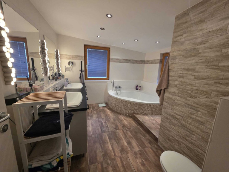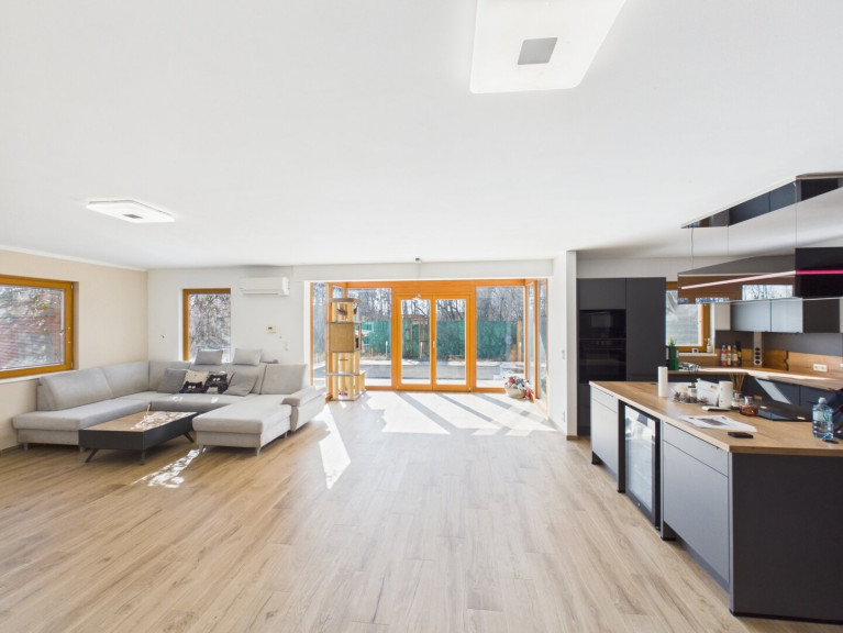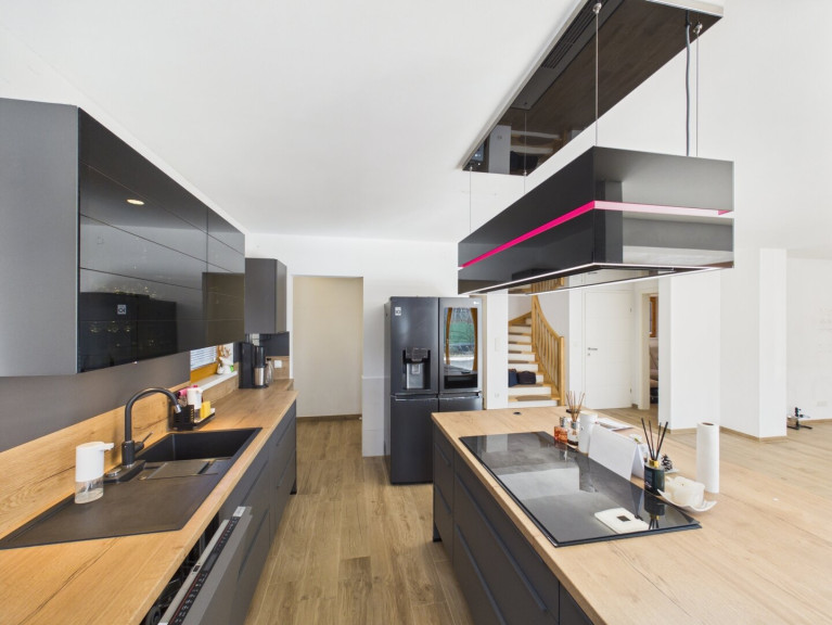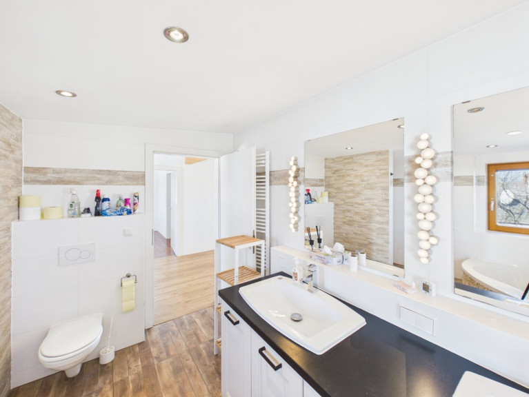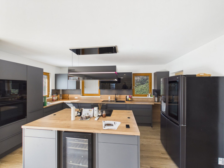 Betreten Sie das Haus und lassen Sie sich von der offenen Wohnküche begeistern, die den perfekten Ort für gesellige Abende mit Familie und Freunden bietet. Hier können Sie kulinarische Köstlichkeiten zaubern, während Sie den Blick auf den Garten genießen. Der großzügige Balkon und die einladende Terrasse laden dazu ein, die warmen Sonnenstrahlen zu genießen und die Seele baumeln zu lassen. Stellen Sie sich vor, wie Sie an lauen Sommerabenden im Freien entspannen oder im eigenen Swimmingpool eine erfrischende Abkühlung finden.