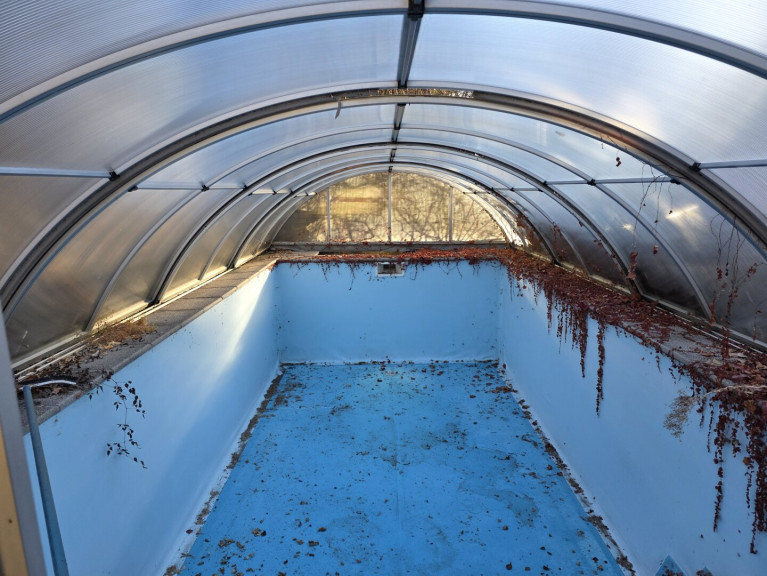 - Brunnen, Gartenhütte und Pool mit Luftwärmepumpe