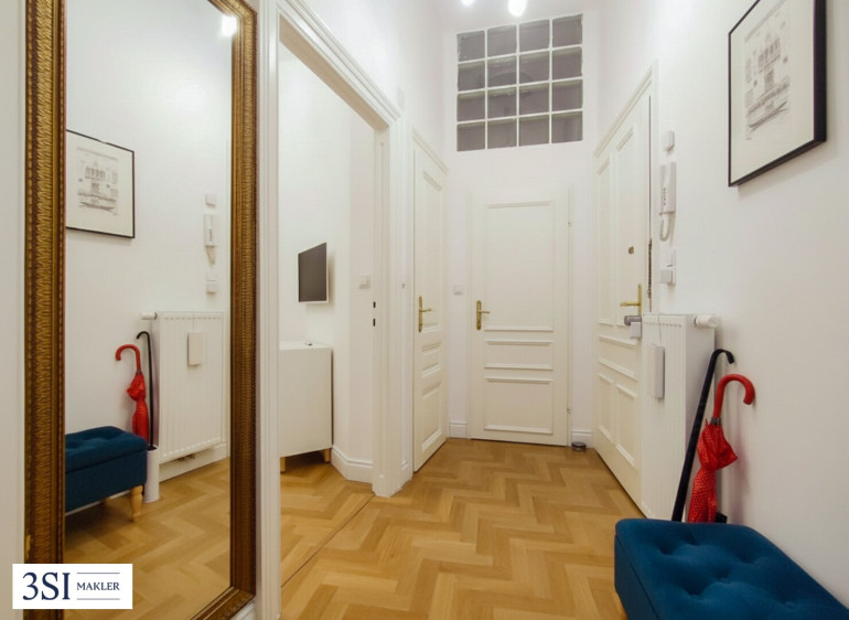 Über das elegante Entrée des stilvollen Gebäudes gelangen Sie in die gepflegte Wohnung im Hochparterre. Die Wohnung wurde vor zwei Jahren mit viel Anspruch an Qualität saniert und präsentiert sich in modernem, stilvollem Wohnambiente. Über den zentralen Vorraum sind alle Räume begehbar. Der großzügige Wohnraum verfügt über eine hochwertige, offene Küche, die sich nahtlos in den Raum fügt. Im hofseitigen Schlafzimmer finden Sie den idealen Platz für entspannte Stunden. Das geschmackvolle Bad ist mit einer geräumigen Walk-in-Dusche und einem Bidet ausgestattet; die separate Toilette verfügt über ein Handwaschbecken.