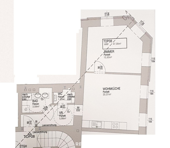 Aus dem Vorraum gelangen Sie in die ca. 20 m² große Wohnküche, das ca. 4 m² große Bad und das separate WC. Das ca. 16 m² große Eckzimmer können Sie über die Wohnküche betreten.