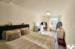 Das Obergeschoss umfasst drei Schlafzimmer, eine Wohnküche mit Essbereich, ein großzügiges Wohnzimmer, ein Badezimmer mit WC sowie ein separates WC. Der Balkon ist vom Essbereich aus erreichbar.