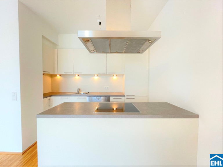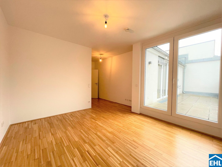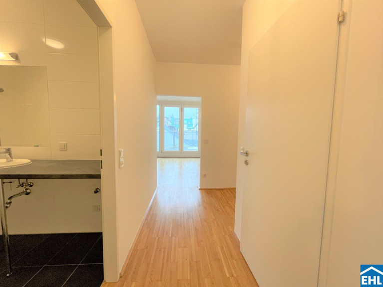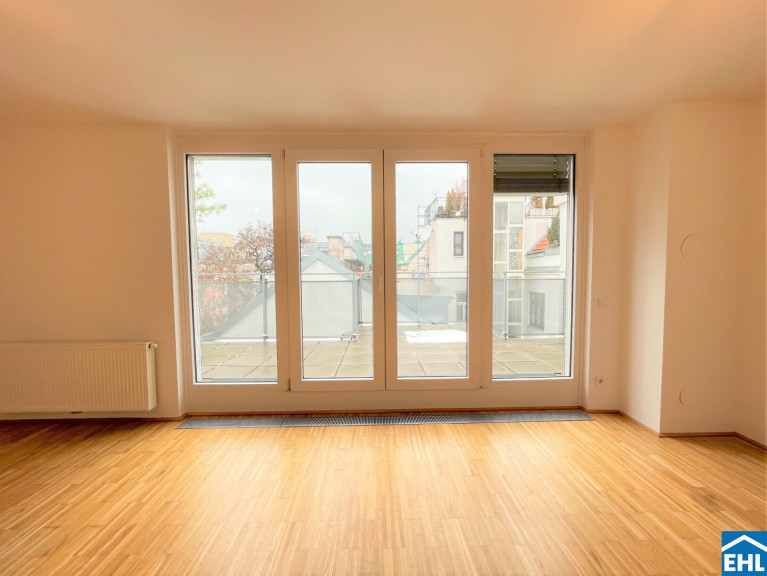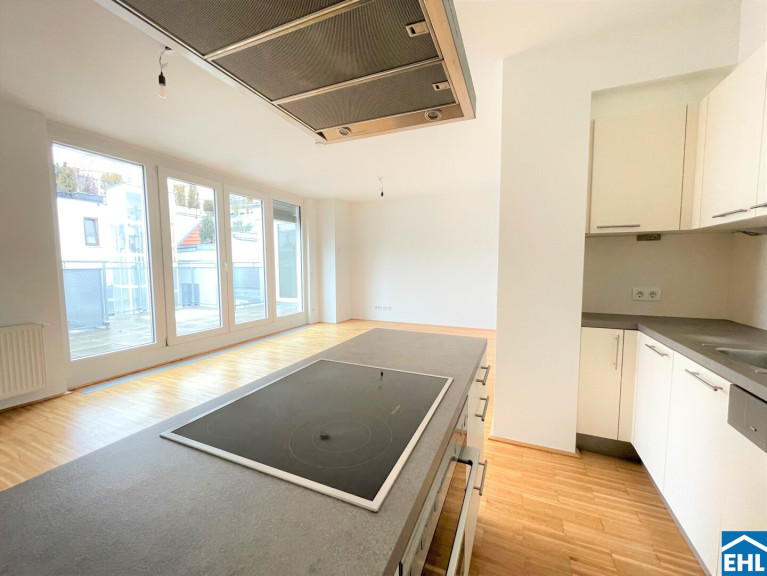 Sie verfügt über eine geräumige Wohnküche, ein großzügig angelegtes Schlafzimmer mit Bad en suite. Beide Räume habe direkten Zugang auf die hofseitige nach Westen ausgerichtete Dachterrasse mit ca. 22m².