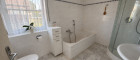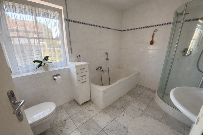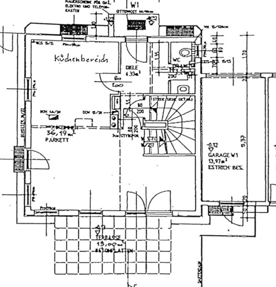 Parkett, Fliesen, Gas, Zentralheizung, Einbauküche, Dusche, Bad mit Fenster, Badewanne, Garage