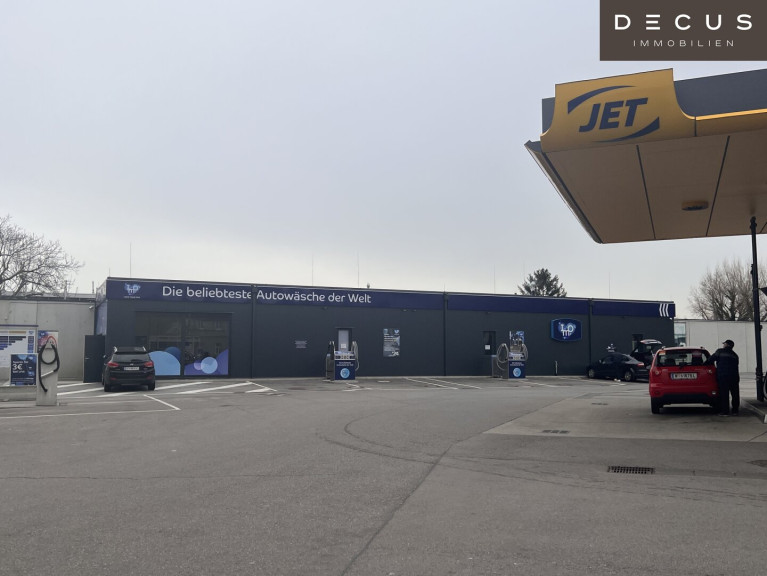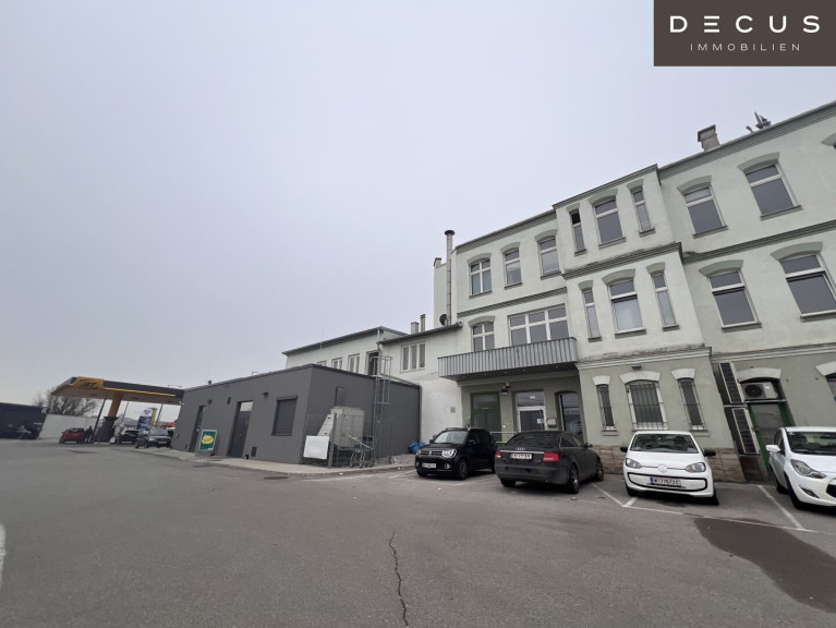 Die Liegenschaft liegt in der Prager Straße. Gleich nebenan befindet sich eine Tankstelle mit einer Autowaschanlage, hinter dem Gebäude ist großer Supermarkt (Billa Plus) samt großem Parkplatz.
