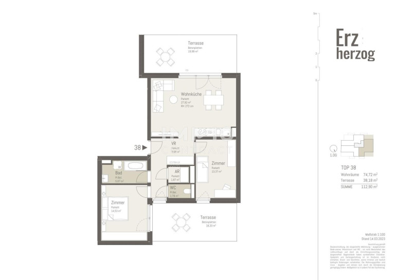 Vom Vorraum geht es in alle Räume getrennt begehbar. Sowohl das Wohnzimmer hat einen Ausgang auf die vorgelagerte Terrasse, als auch beide Schlafzimmer auf eine weitere Terrasse.